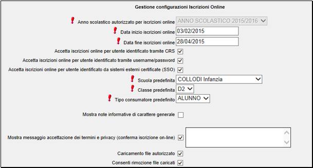 Subito sotto questi campi sono presenti i campi per la configurazione dei Parametri generali delle iscrizioni online.
