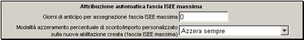 · La seconda opzione, Modalità azzeramento percentuale di sconto/importo personalizzato sulla nuova abilitazione creata (fascia ISEE massima) permette di stabilire se la percentuale di sconto dev’essere conservata o meno quando si utilizza il servizio di Attribuzione fascia ISEE massima.