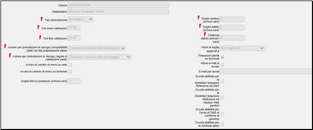 · Il campo Soglia debito (school-card) definisce il limite di debito per i consumatori. Questo significa che quando il numero delle prenotazioni non prepagate raggiunge il valore stabilito, il consumatore comparirà in un report situazione credito. Ad esempio, supponendo che il valore inserito nel campo Soglia debito (school-card) sia 2: il consumatore ha esaurito il suo credito prepagato e raggiunge un saldo di 0€, ma utilizza altre due prenotazioni. Quando questo succede, il numero delle prenotazioni non pagate (2) è uguale al valore inserito nell’opzione Soglia debito (school-card), e il nome di questo consumatore comparirà in un report situazione credito.