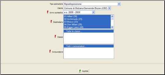 Selezionare quindi un Anno scolastico, almeno un Destinatario, almeno una Classe e almeno un Consumatore. Cliccare quindi sul pulsante Applica per passare alla scheda Stampa CIM.