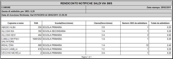 Il secondo report si chiama Rendiconto notifiche saldi via SMS. Con questo report è possibile conoscere quanti SMS di notifica saldo sono stati inviati dal sistema ai genitori che ne hanno fatto richiesta e calcolare il relativo prezzo totale da addebitare.